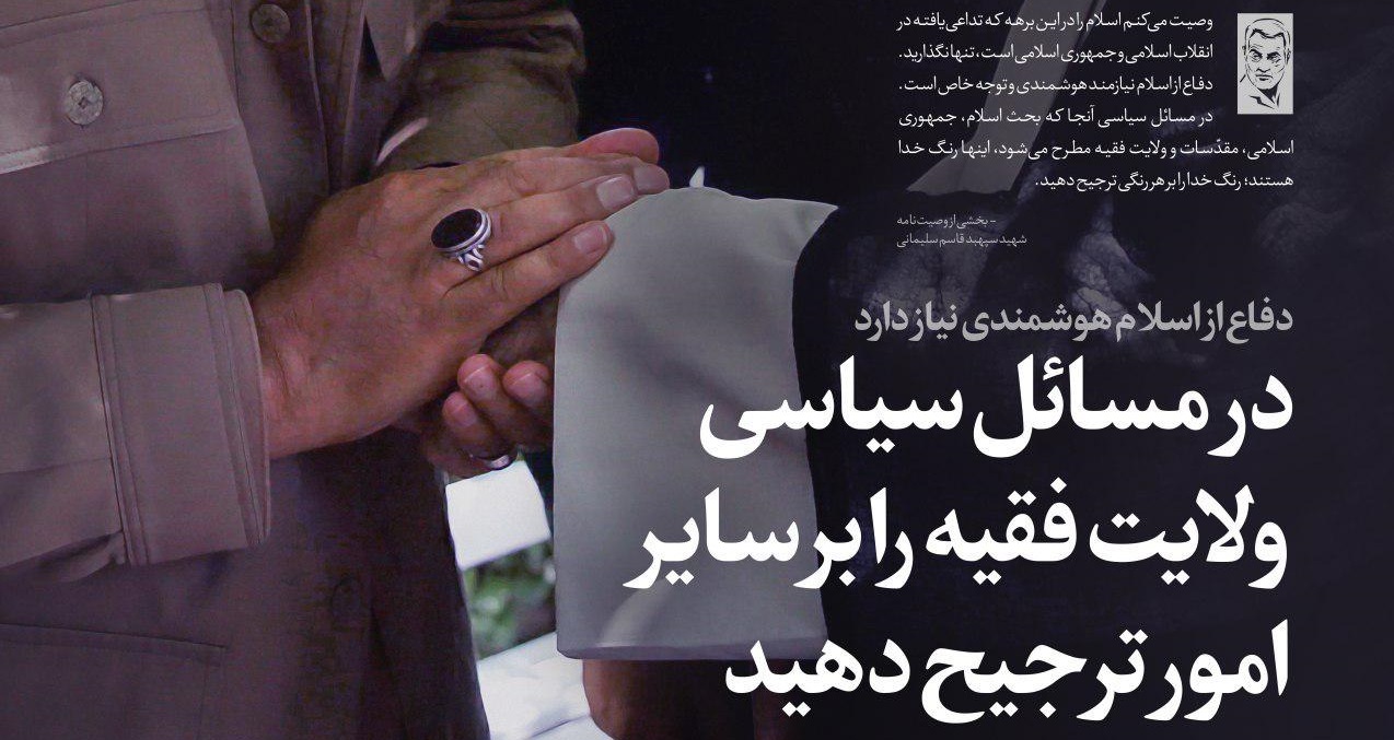 با این مقدمه کوتاه می توان اذعان کرد که وصیت نامه حاج قاسم، وصیت نامه ویژه ای است، چرا که او سالها درباره آنچه می نویسد اندیشیده و خود را دربرابر آنچه خواهد گفت، اول در پیشگاه خداوند مسئول دانسته است لذا این وصیت نامه یک وصیت نامه معمولی قلمداد نبوده و می تواند به عنوان شاخص و معیار مورد توجه مسئولان و مردم قرار گیرد. با بررسی این وصیت نامه پی می بریم که دال مرکزی و نقطه کانونی توجهات و دغذغه های سردار دلها، اسلام و ولایت فقیه است. ایشان از کلی گویی امتناع نموده و دقیقاً انگشت اشاره را روی کلید واژه ها و اصول گذاشته است تا هیچ برداشت دیگری غیر از آن گردد و آن موارد عبارتند از: اسلام، ولایت فقیه و مردم.